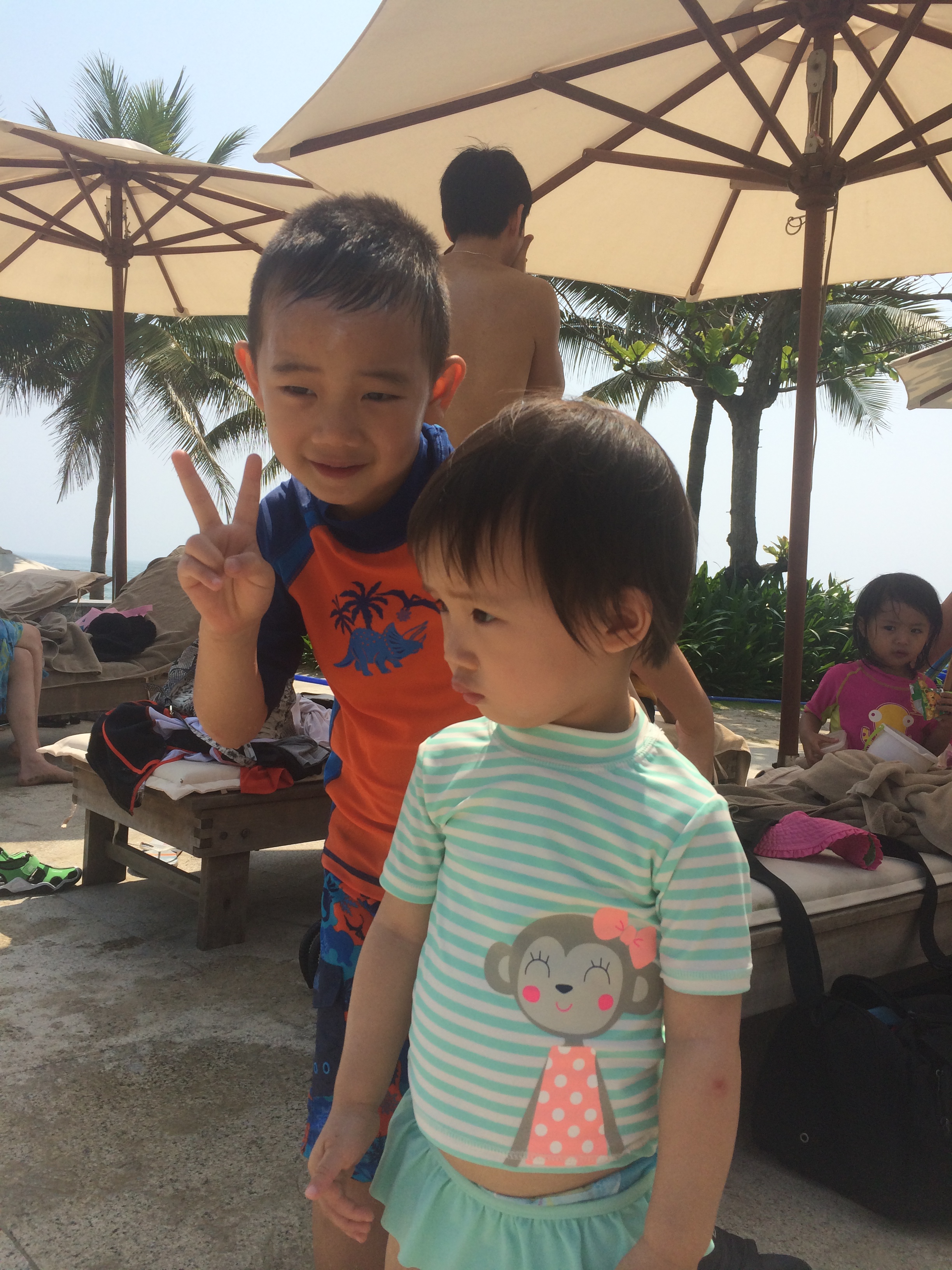 在游泳池耗了一整個上午,下午小朋友就衝到海灘去. 我已經不記得普吉島沙灘的觸感如何,但是一踏上這邊的沙灘,你會覺得好舒服,因為它的沙超級柔軟的,踩起來特別享受。