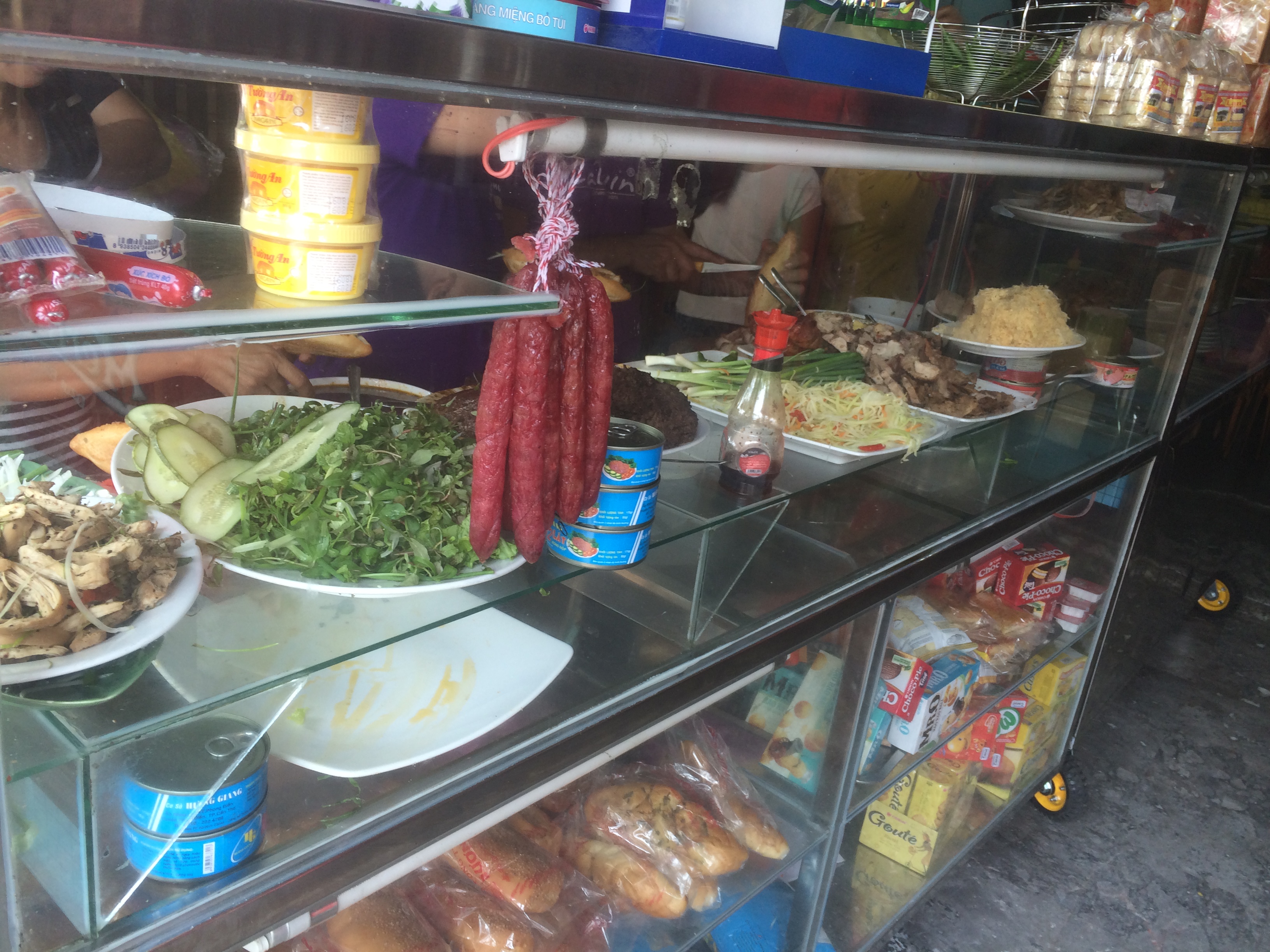 另外一個舉世聞名的越南小吃是越式三明治。受到法國影響,越式三明治除了適用清脆的法式麵包做成,裡面夾了豬肉,美乃滋,鵝肝醬,小黃瓜,香菜和青蔥等等材料。在峴港這家小店,因為美國知名廚師跟節目主持人Anthony Bourdain 在節目上介紹過而大夯,不僅有很多觀光客,也有很多當地的人騎摩托車來買。店面從之前的小小一攤,搬到了現在這個有座位的地方。我們去的那天,生意超好的,前面做三明治的小姐們手根本沒停過。來看看裡面到底放了些什麼?