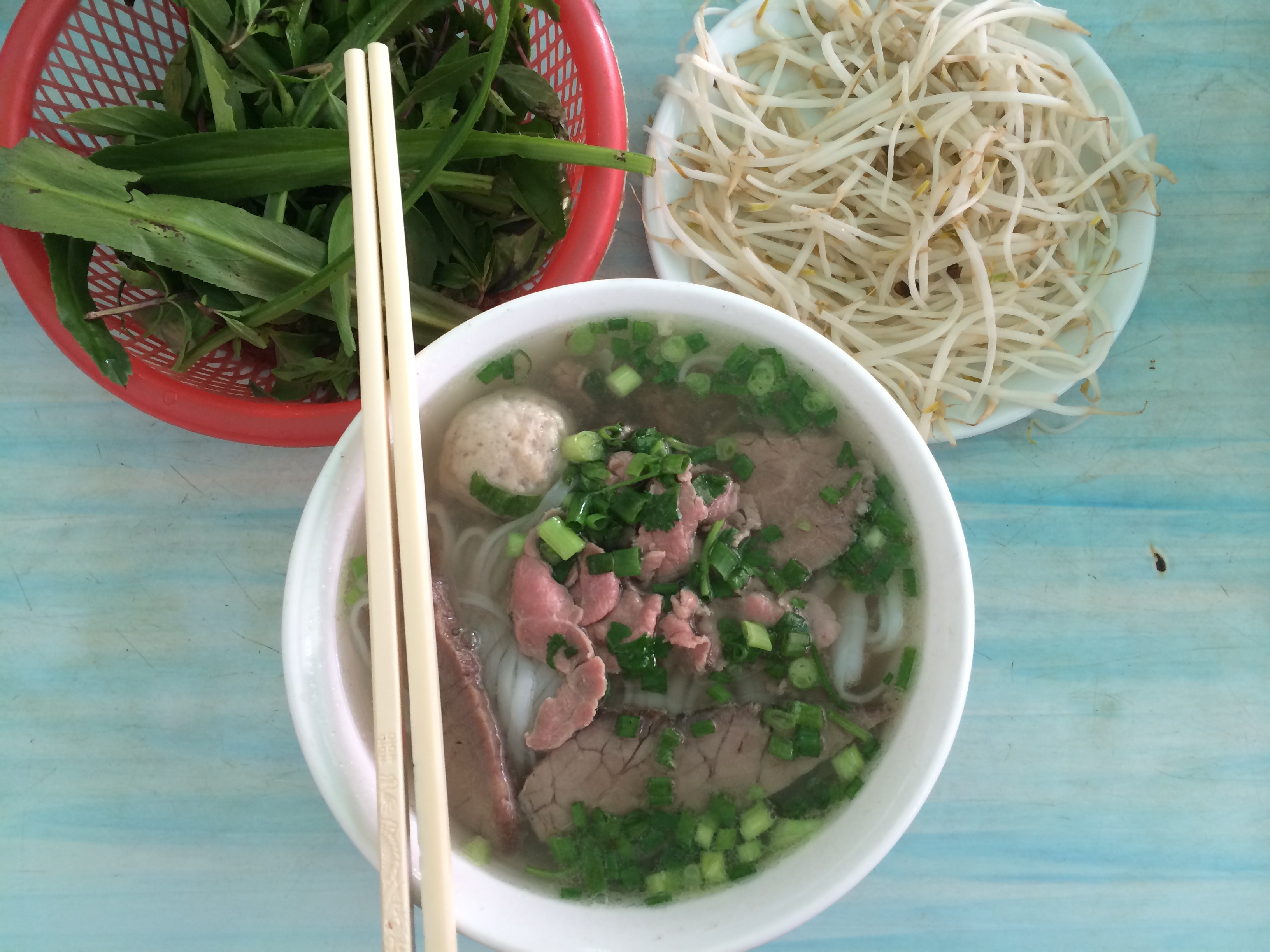 One of the things about eating at tourist traps is that they are relatively clean and presentable to foreigners. So when we pulled up, I had some reservations about the red buckets underneath each table. What are they for? Putting bowls and plates when you’re done? Throwing away trash? I’m not sure but I was hungry and didn’t care. When the first bowl of Pho Bo was served, I was giddy.