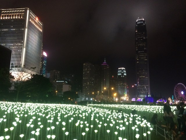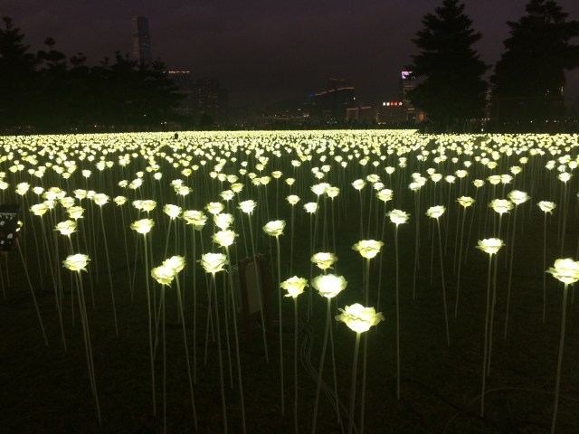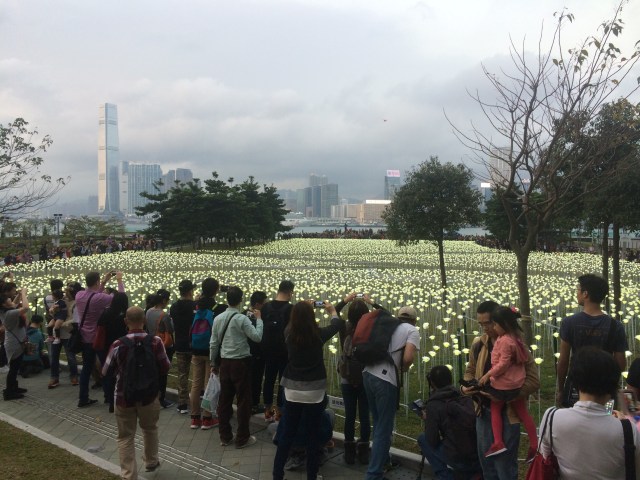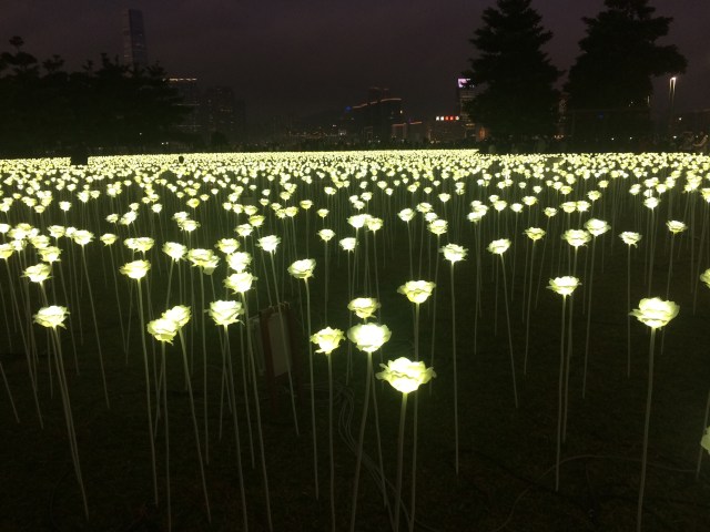 The roses light up each night and instantly illuminate the park against the backdrop of Hong Kong’s skyline. Couples, families and friends flock to take photos.